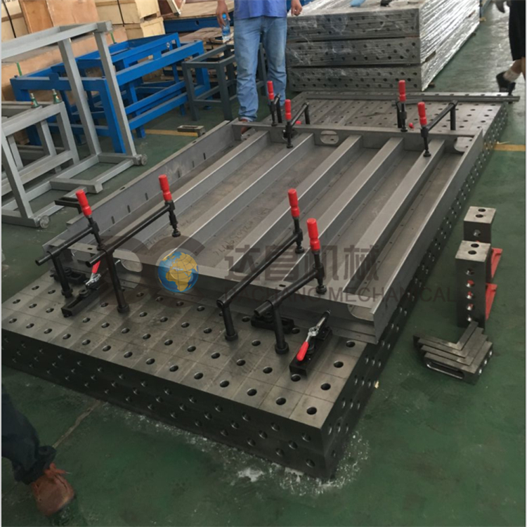 2、柔性化:多孔焊接平臺的承載能力高,鋼性穩(wěn)定,它的五個面均加工有規(guī)則的孔,并刻有網(wǎng)線。焊接平臺可方便地延伸和擴展,組合。經(jīng)擴展的標(biāo)準(zhǔn)臺面可模塊化的定位和夾緊直接連接在一起。在安裝、調(diào)整和定位工件過程將柔性三維組合焊接工裝系統(tǒng)的通用功能展示出來,尤其在了大型工件方面的應(yīng)用上。