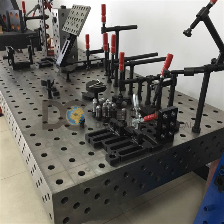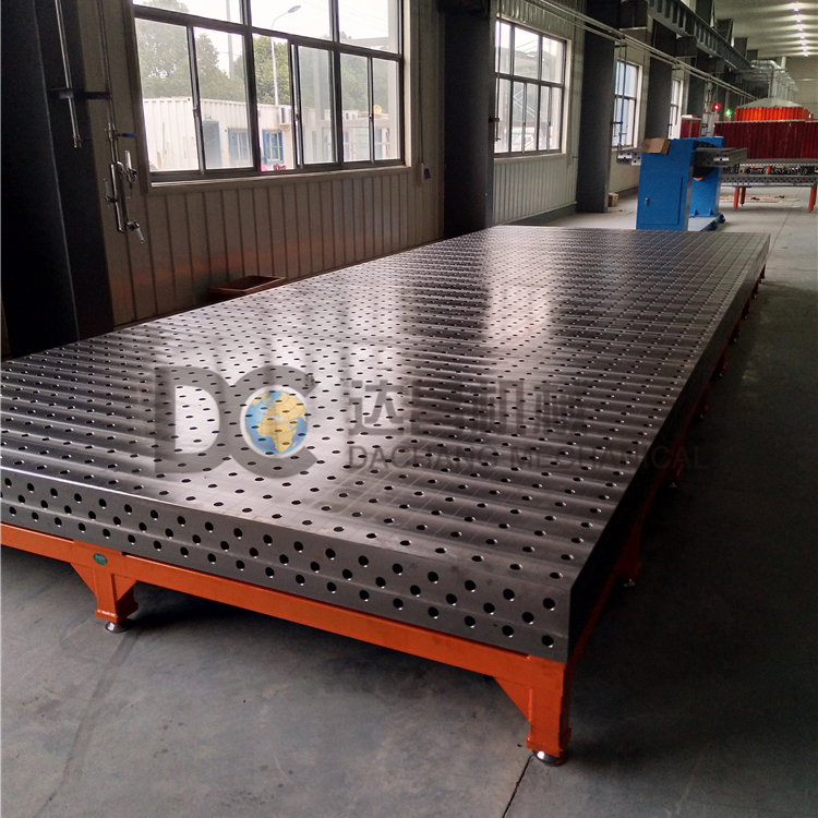 工作臺的五個工作面都有100x100 mm(D28系列)或50x50mm(D16系列)的帶有網格標注的孔。其五個面的平面、平行、垂直公差精度以及孔與孔的位置精度都是非常高的,保證在臺面上的定位和臺面與其它模塊之間的組合都具有足夠的使用精度要求。基礎臺面的尺寸從1000x1000mm到4000x2000mm可以任意選擇,非標尺寸可以定做。